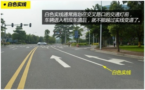 白色实线的作用是分隔同向车道,通常施划在交叉路口的交通灯前。不少人开车压线违章被拍,压的基本上就是这种标线。