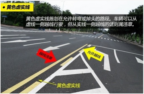 黄色虚实线通常施划在桥梁前后及允许掉头的路段,也能起到分隔双方向车道的作用。黄色实线一侧禁止车辆越线或压线行驶,虚线一侧准许车辆暂时越线或转弯。
